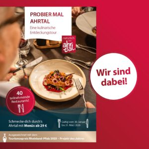 So losgelöst kommen Sie dann zum Abendessen. An Ihrem Anreisetag servieren wir Ihnen ein 3-Gang-Wahlmenü. Begrüßt werdne Sie mit eine Glas Sekt. Darüber hinaus kredenzen wir Ihnen das 3-Gang-Menü Probier mal Ahrtal Menü 2026