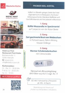 Wir verwöhnen Sie 3 Tage lang mit dem Besten aus Küche und Keller, und dies zum attraktiven Kennenlern – Vorteil – Preis. Also auf ins Ahrtal zum Frühlingsboten von der Post.